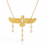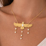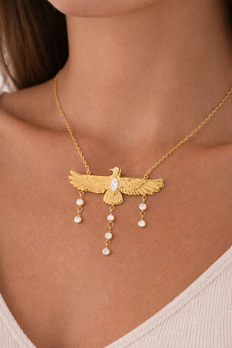The Celestial Falcon Pendant Necklace is a striking symbol of strength, freedom, and elegance. Crafted in a radiant gold-tone finish, the finely detailed falcon spreads its wings in a powerful yet graceful silhouette. A marquise-cut crystal at the center adds brilliance, while delicate bezel-set crystals cascade below, catching the light with subtle movement. Suspended from a refined chain, this necklace blends mythic inspiration with modern luxury—perfect as a statement piece for evening wear or as a meaningful accent to elevate everyday looks.