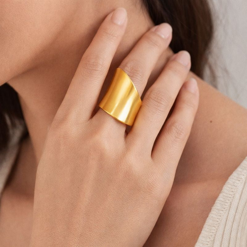 The Solis Wide Gold Band Ring is a striking expression of modern minimalism. Crafted with a smooth, high-polish gold-tone finish, its wide silhouette delivers bold impact while maintaining clean, refined lines. Designed to stand alone, this ring elevates everyday styling with effortless confidence.