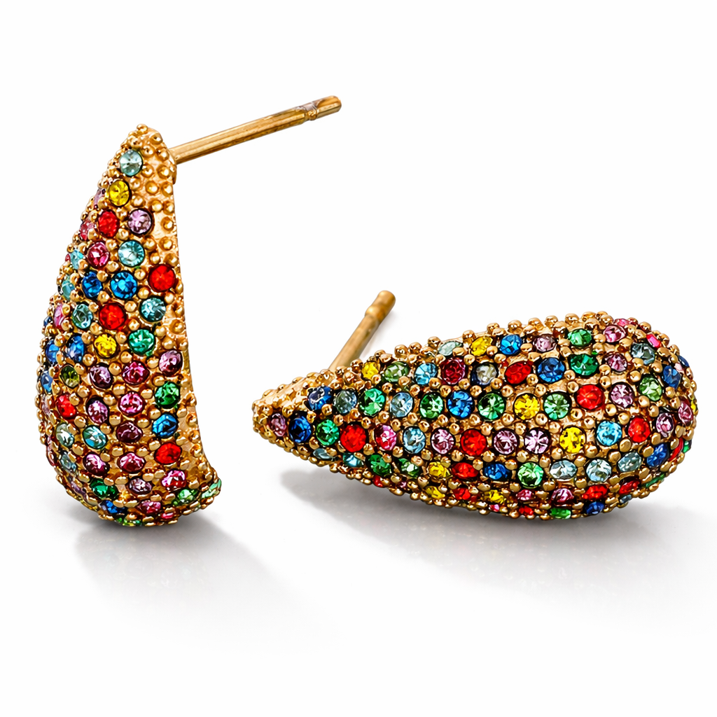 Brighten up your style with the Colorwave Glam Earrings, a dazzling blend of vibrant hues and luxurious gold plating. Encrusted with a stunning array of colorful zircon stones, these earrings radiate joy and sophistication. The curved silhouette and intricate stone setting add a touch of bold elegance, making them perfect for statement looks. Whether you're dressing up for a festive occasion or adding a splash of color to your everyday outfit, these earrings are your go-to accessory.