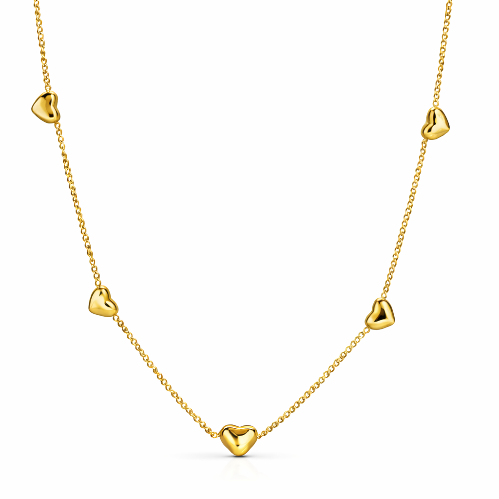 This delicate 18K Gold plated necklace features charming heart-shaped accents spaced gracefully along a twisted chain, exuding a playful yet elegant vibe. Perfect for adding a touch of romance to casual outfits or enhancing special occasions, this piece is versatile and timeless.