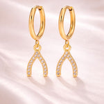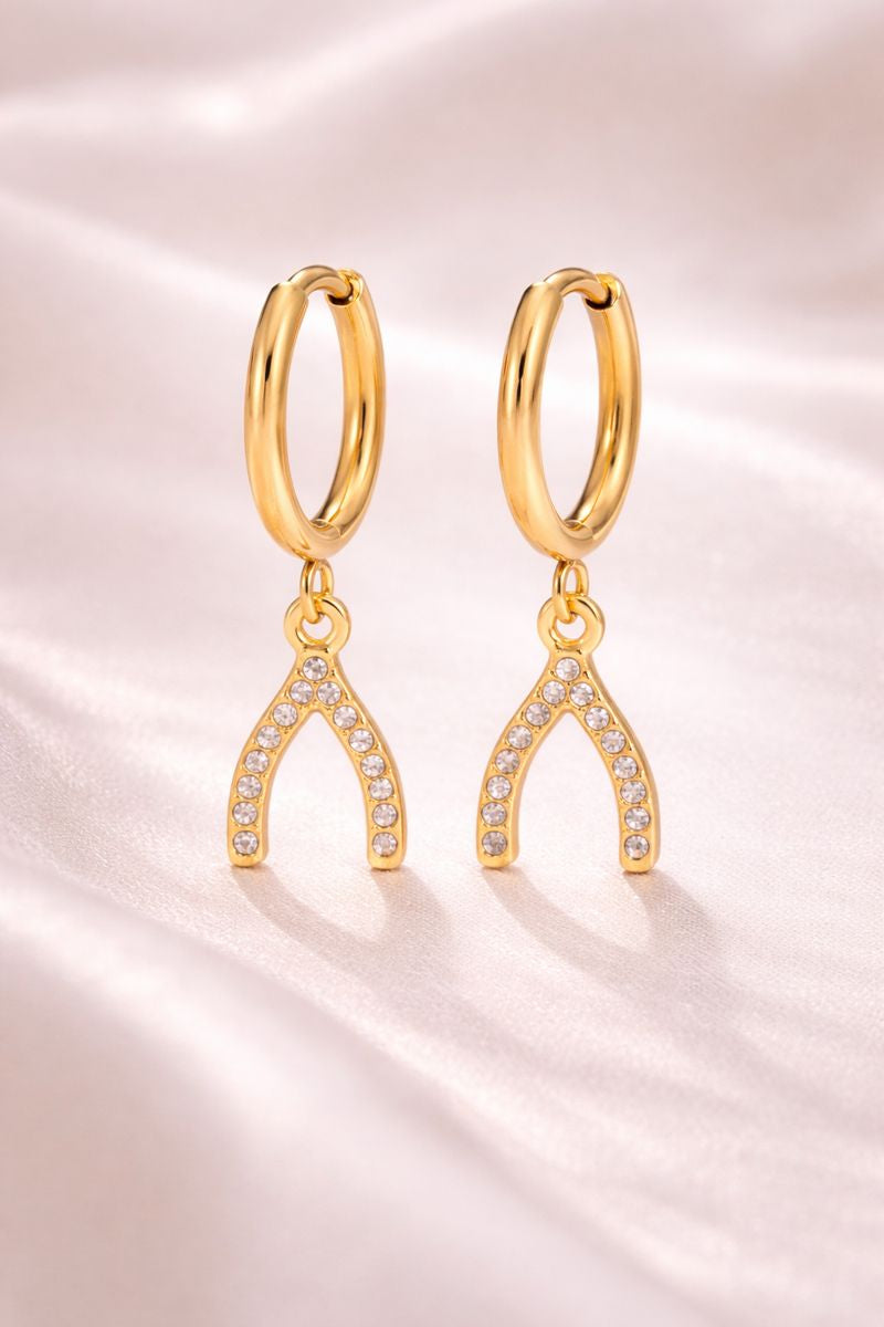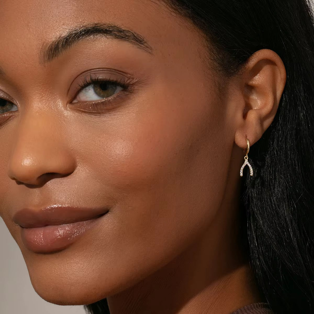The Wishbone Crystal Earrings blend subtle symbolism with everyday sparkle. Featuring a smooth gold-tone hoop paired with a pavé crystal wishbone charm, this design represents luck and possibility. Lightweight and refined, they’re perfect for daily wear or meaningful gifting.