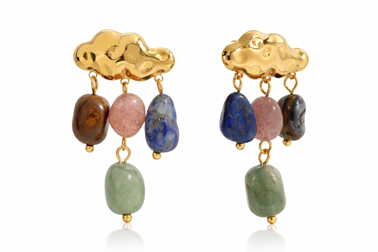 Inspired by drifting clouds and organic forms, the Cloudform Pebble Drop Earrings feature a sculpted gold cloud stud paired with naturally shaped pebble stones in earthy and celestial hues. Each rounded drop moves gracefully, creating a soft yet striking silhouette that blends modern design with an artisanal, free-spirited charm. Perfect for statement styling with effortless elegance.