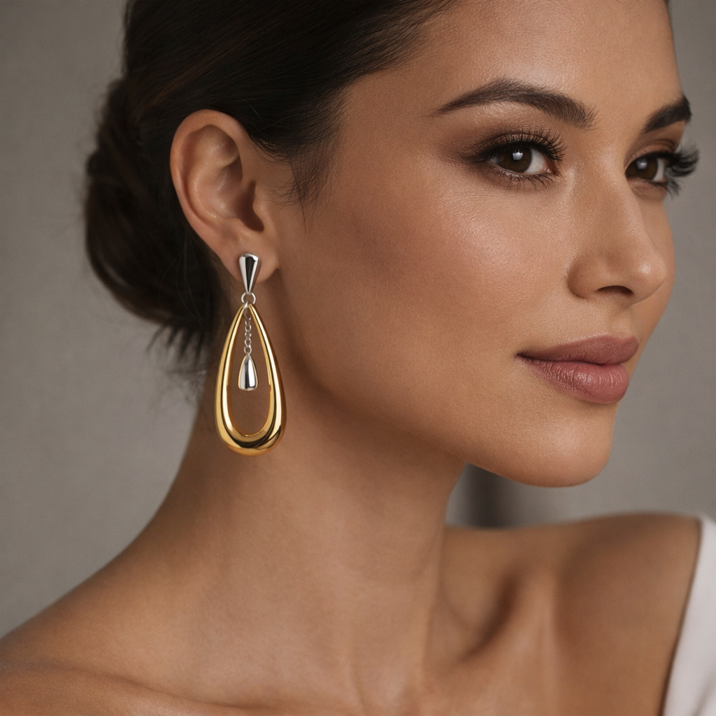 Designed with graceful curves and refined contrast, the Elara Dual-Tone Drop Earrings combine a luminous gold-tone silhouette with a suspended silver-tone accent. The layered teardrop design adds depth and movement, offering a modern statement that remains timeless and versatile.