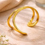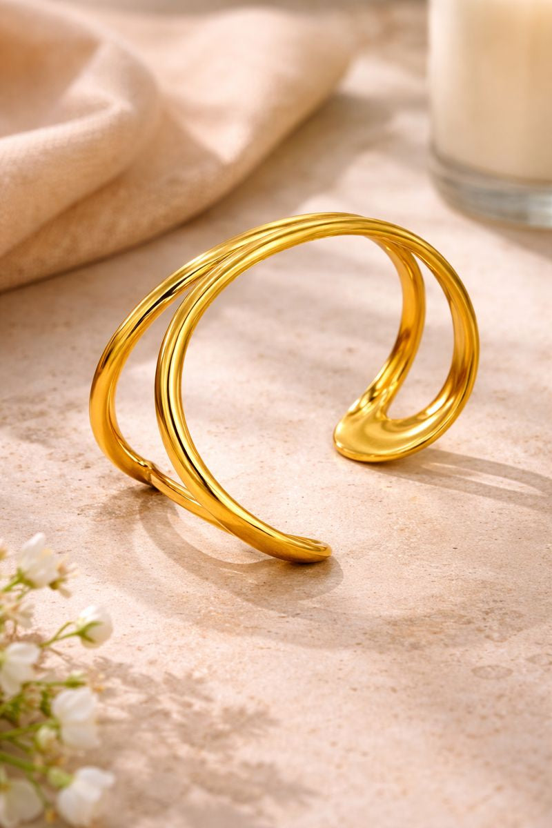 Elevate your wrist stack with the Aura Dual Cuff, a statement piece blending sculptural design with minimalist aesthetics. This open cuff bracelet features a sleek, high-polish finish and a double-band, "double helix" silhouette that wraps gracefully around the wrist.
