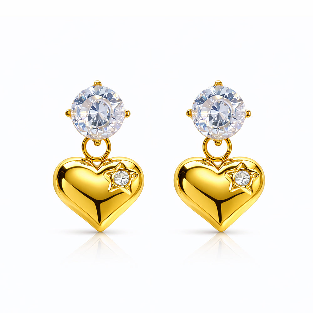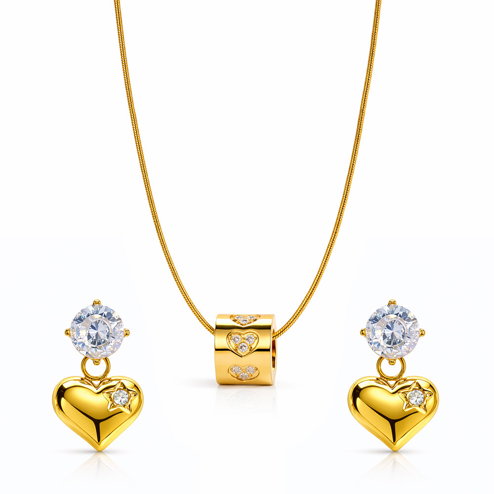 Where romance meets radiance, the Starlit Heart Luxe Set is designed to shine from every angle. Brilliant round stones crown each earring, leading to polished gold hearts accented with a delicate star detail — a subtle symbol of dreams, light, and love. The coordinating pendant features a sleek gold charm adorned with sparkling heart motifs, suspended from a refined chain for a modern finish.