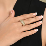 This exquisite ring features a sleek 18K Gold plated band intricately set with cubic zirconia's that create a dazzling, textured surface. Its elegant design and luxurious finish make it a perfect accessory for formal events or special occasions, adding a touch of sophistication to any outfit.