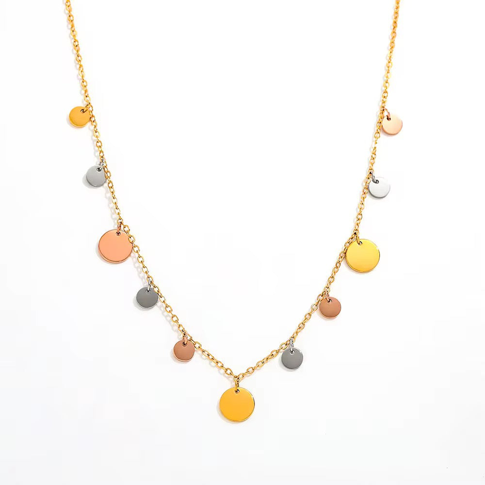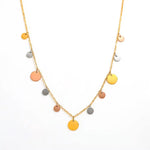 . This delicate, golden chain features an array of shimmering, multi-toned discs in radiant gold, soft rose gold, and sleek silver/grey. Each disc captures and reflects light, creating a beautiful "aura" effect around you. Perfect for layering or as a standalone statement piece, this versatile necklace adds a touch of modern elegance and a playful burst of color to any outfit, from casual chic to evening glam.