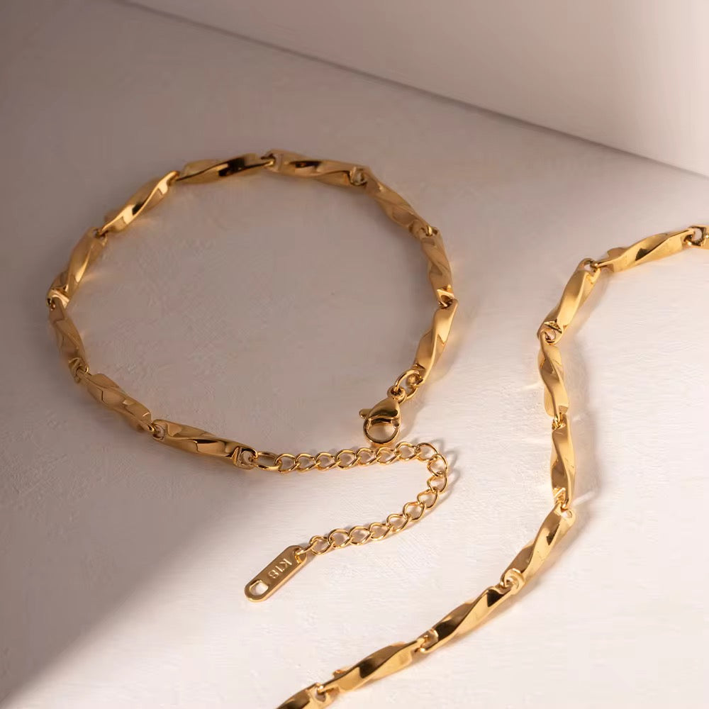 The Aurelia Twist Bracelet is where modern sophistication meets timeless beauty. Crafted with precision and plated in rich 18K gold, its distinctive twisted links catch the light from every angle, creating a fluid shimmer with every movement.