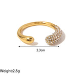 Embrace elegance with the Aurum Éclat Band, a masterpiece of refined sophistication. Crafted from premium 18K gold plating, this open-ended ring features a sleek, contemporary design. One end glistens with a brilliant cluster of crystals, while the other shines with a smooth, polished finish — a perfect harmony of radiance and minimalism.