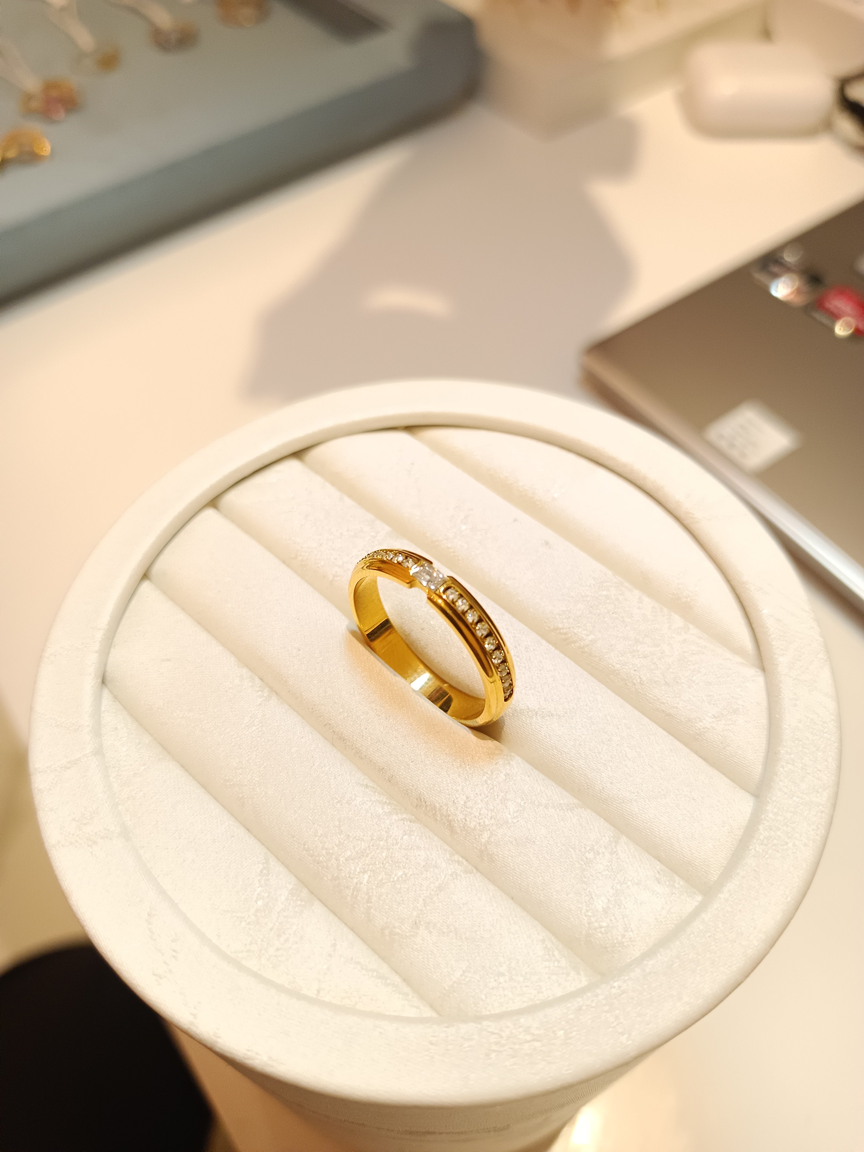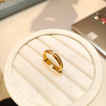 The Aurum line  Ring is a testament to understated elegance. This minimalist band features a channel of brilliant, micro-set stones that catch the light, creating a subtle yet captivating glow. Crafted from polished gold, its sleek design and delicate sparkle make it a versatile piece perfect for everyday wear or as a sophisticated accent to any look. It's a modern classic designed to be worn alone or stacked with other rings.