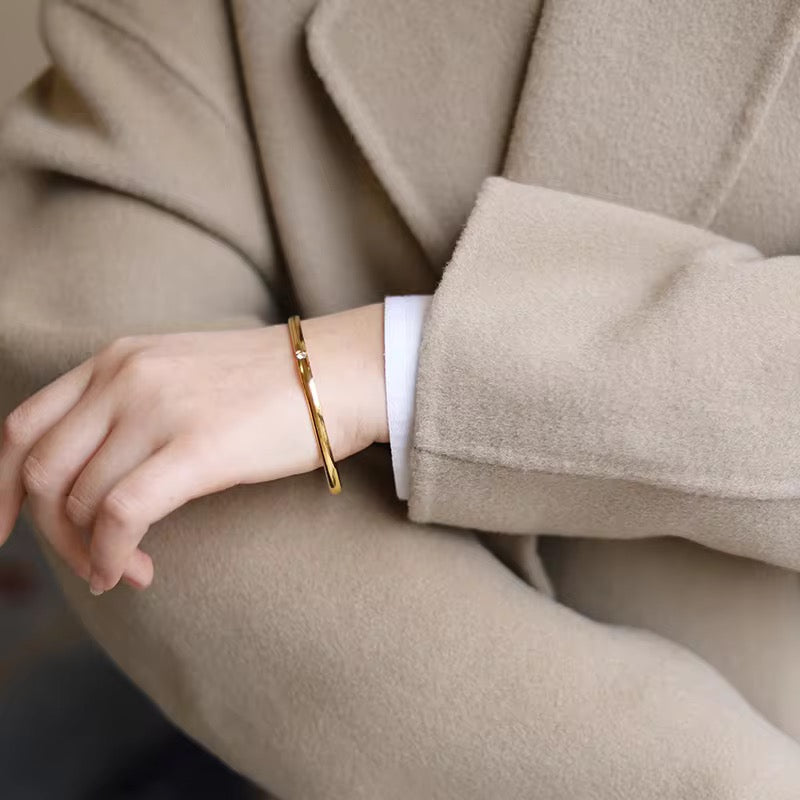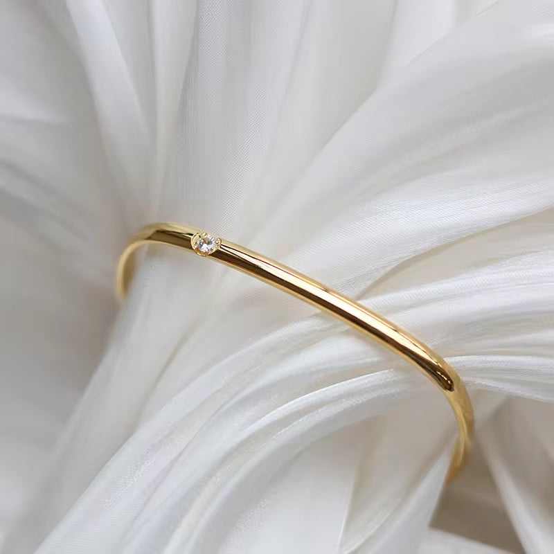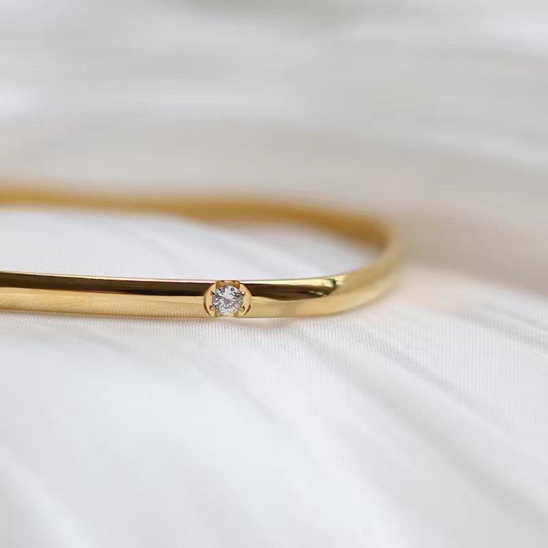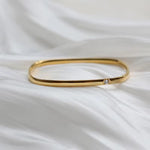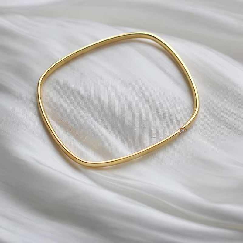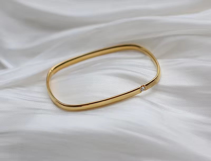 Understated yet striking, the Lumière Solitaire Bangle features a sleek rectangular design finished in radiant 18k gold plating. At its center lies a single glimmering stone, creating a perfect balance of elegance and minimalism. Whether worn solo or stacked, this piece adds a sophisticated edge to any outfit — the ideal everyday luxury for the modern muse.