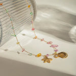 Add a burst of oceanic charm to your look with the Coral Splash Necklace. Featuring a delicate 18k gold-plated chain adorned with vibrant, multicolored stones, this necklace captures the beauty of sunlit tides and coastal treasures. The playful sea-inspired charms, including a radiant seashell, twinkling starfish, and shimmering crystal, evoke the serene elegance of the shoreline.