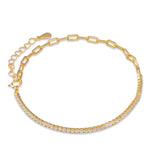 This elegant tennis bracelet features a combination of sleek 18K Gold plated-toned links and a sparkling row of shimmering stones, creating a sophisticated contrast. The adjustable chain ensures a perfect fit for enhanced comfort and style. Ideal for both casual outings and formal events, this bracelet adds a touch of glamour to any ensemble.