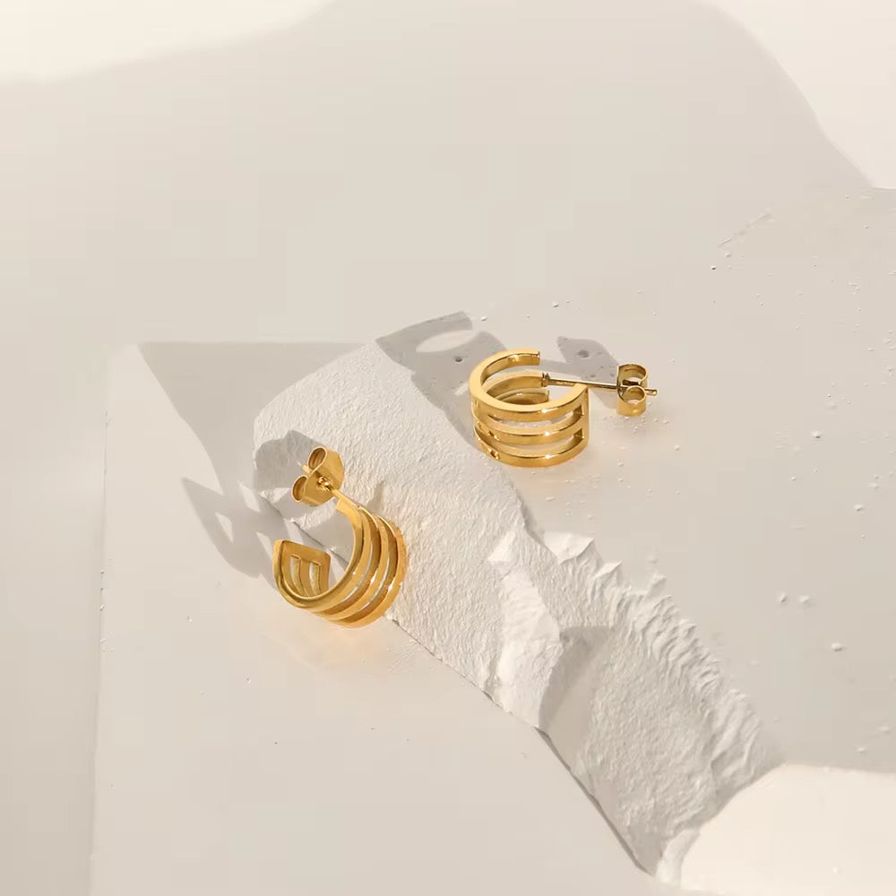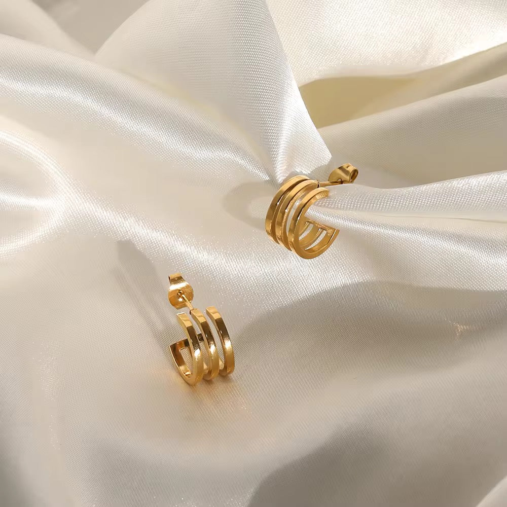 Sleek. Sculptural. Striking. Our Triple Arc Hoops feature a bold triple-band design in a radiant gold-plated finish that effortlessly blends modern minimalism with timeless elegance. These structured half-hoop earrings are lightweight yet impactful—perfect for elevating your daily looks or adding a contemporary edge to your night-out attire.