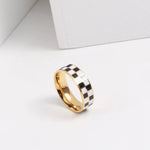 A bold fusion of elegance and geometry, the Eterna Grid Ring features a sleek checkerboard enamel inlay set against a radiant gold band. Its contemporary design balances minimalism with statement-making detail, making it perfect for those who embrace individuality with style. Whether worn solo or stacked, this ring adds a modern edge to any look.