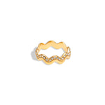 This elegant 18K Gold plated ring features a wavy design adorned with cubic zirconia, crafted for both style and comfort. Its unique shape and shimmering accents make it a statement piece in any jewelry collection. Ideal for both casual outings and formal events, this ring adds a touch of sophistication to any ensemble.