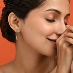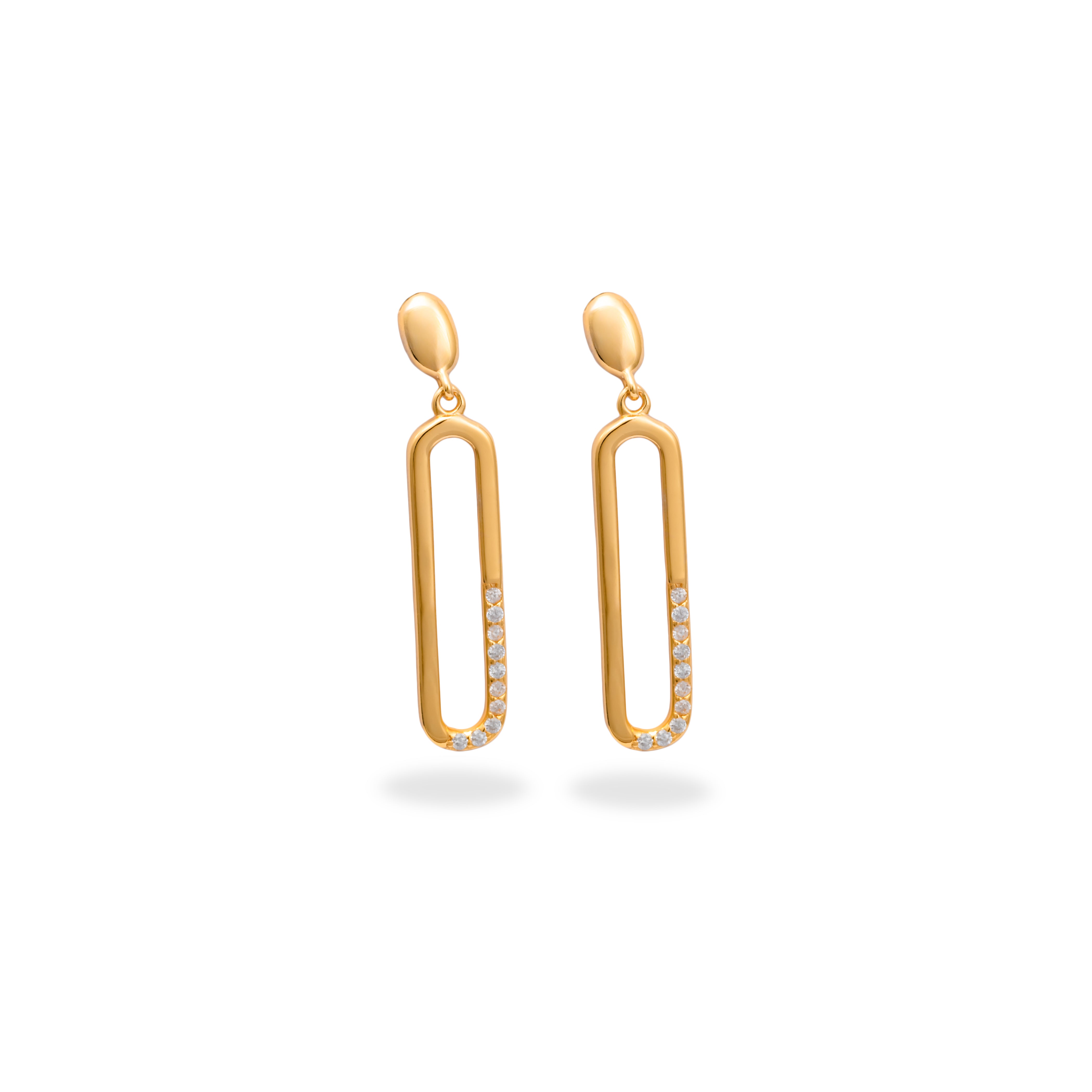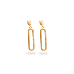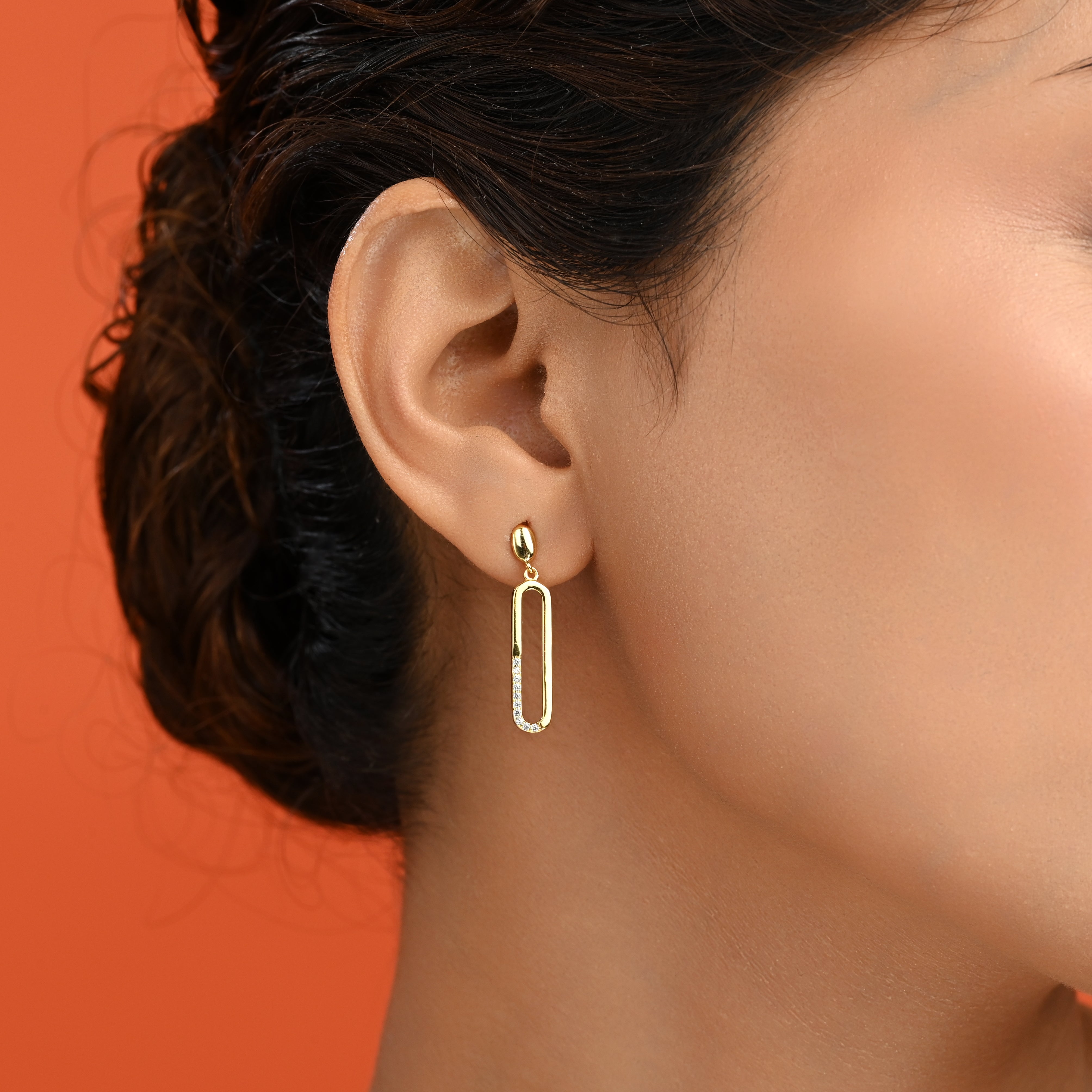 These elegant 18K Gold plated-tone earrings feature a sleek geometric design with an elongated oval shape, enhanced by a line of sparkling gemstones along one side. The lightweight construction ensures comfortable wear for extended periods. Perfect for adding a touch of sophistication to both casual and formal outfits.