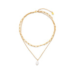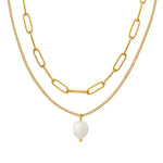 This elegant layered necklace features a stunning combination of 18K Gold plated-link chains with a lustrous pearl pendant, adding a touch of sophistication to any outfit. Its modern design effortlessly transitions from casual to formal occasions. Perfect for enhancing everyday wear or complementing special event attire.