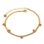 This elegant bracelet features a delicate chain adorned with heart charms, crafted from high-quality 18K Gold plated metal for a radiant finish. The adjustable chain ensures a perfect fit, secured with a reliable lobster clasp. Ideal for gifting or adding a sentimental touch to any outfit, it beautifully complements both casual and formal looks.