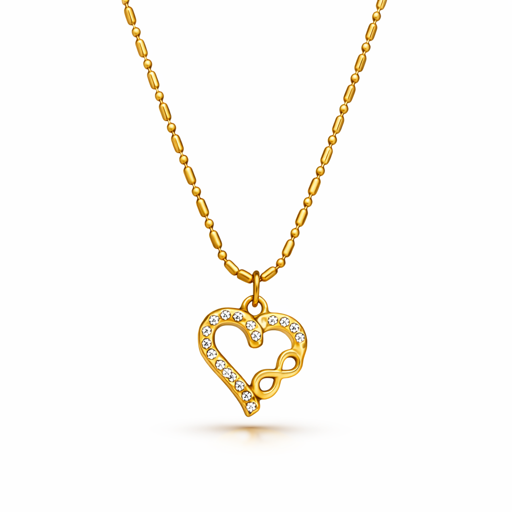 This exquisite necklace features a stunning heart pendant adorned with sparkling stones, intertwined with an infinity symbol, representing everlasting love. The delicate 18K Gold plated chain adds a touch of elegance, making it a perfect accessory for any occasion. Ideal for gifting on special moments like anniversaries or Valentine's Day, this piece beautifully conveys heartfelt sentiments.