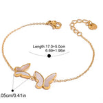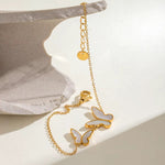 Embrace delicate elegance with the Luna Flutter Bracelet. Featuring twin butterfly charms crafted from radiant mother-of-pearl, this 18k gold-plated bracelet exudes timeless grace. Adjustable for a perfect fit, it adds a touch of ethereal beauty to any look. Ideal for day-to-night transitions, this bracelet is a celebration of nature’s delicate charm.