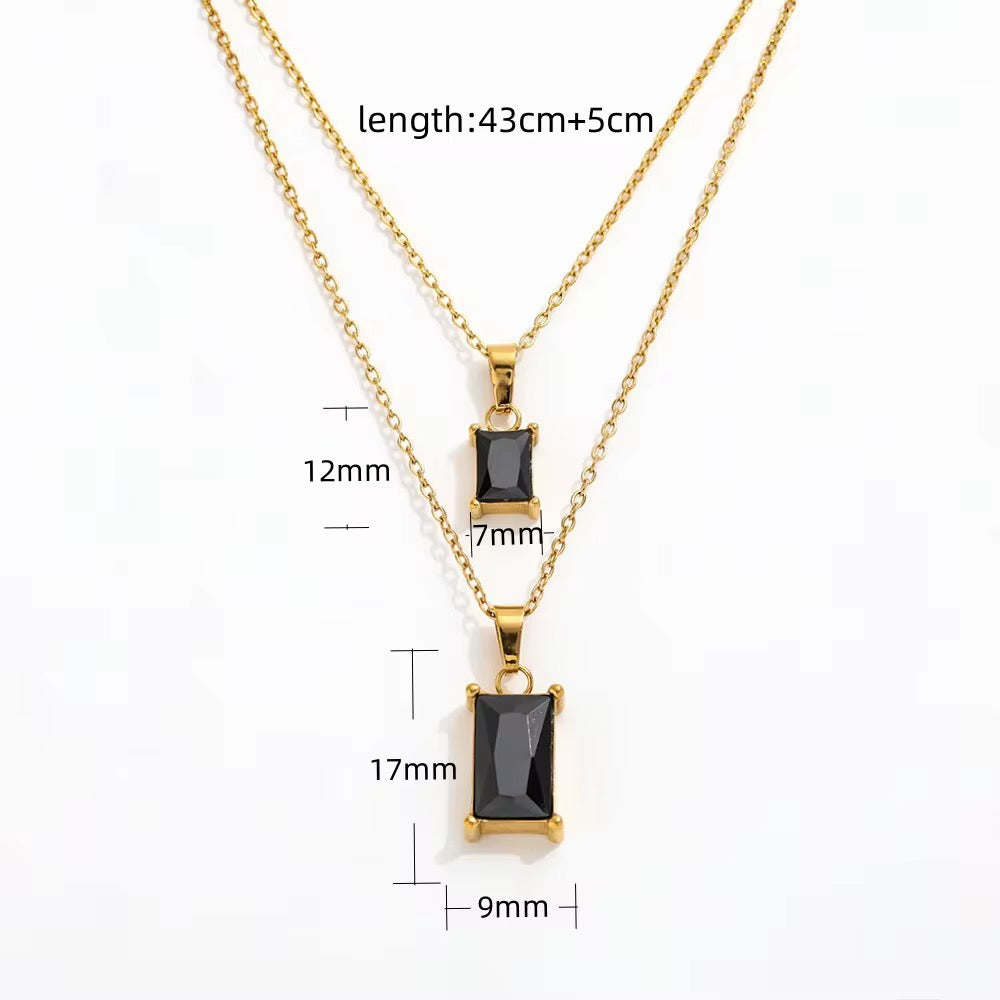 A double-layered, gold-toned necklace featuring two chains of different lengths. Each chain has a rectangular black pendant. The shorter chain has a smaller pendant (12mm x 7mm), while the longer chain has a larger pendant (17mm x 9mm). The overall length of the necklace is adjustable, with a total length of 43cm plus an additional 5cm extension. The pendants are described as having black onyx stones