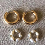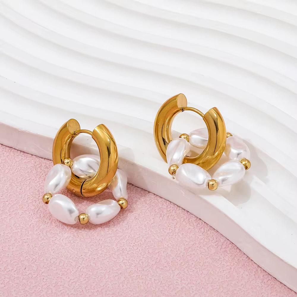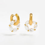 Make a bold statement with our Pearl Orbit Daze Hoops — where timeless pearls meet contemporary design. These gold-plated huggie earrings are adorned with a circular arrangement of luminous oval pearls, each accented with golden beads that bring a playful yet polished finish. Perfect for turning heads, whether you're at brunch or a formal soirée.