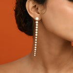 These elegant earrings feature a series of lustrous pearls cascading in a delicate drop design, secured with a subtle top pearl. Crafted to perfection, they offer a sophisticated shine and graceful movement with every wear. Ideal for formal occasions or adding a touch of elegance to everyday attire.