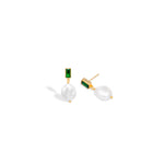These elegant earrings feature lustrous white baroque pearls complemented by a rectangular emerald-cut green stone, all set in a delicate 18K Gold plated frame. Perfect for adding a touch of sophistication to both casual and formal outfits, these earrings are a versatile accessory for any occasion.