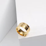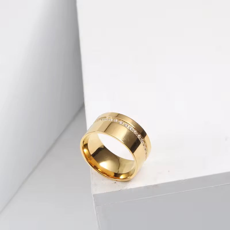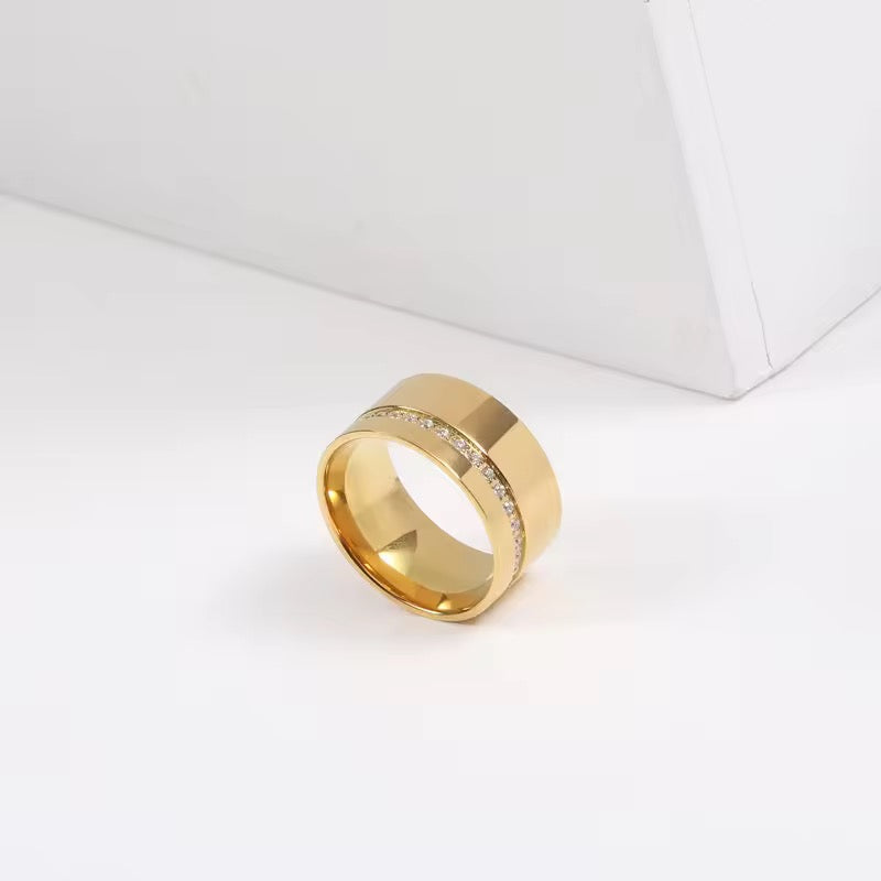 Bold, elegant, and timeless — the Regal Line Ring is crafted with a wide band of high-shine 18K gold plating, featuring a sleek line of shimmering zircon stones embedded at its center. Its modern silhouette and luxurious finish make it the perfect statement ring for both everyday edge and evening glamour. Comfortable yet commanding, this piece is ideal for stacking or wearing solo for maximum impact.