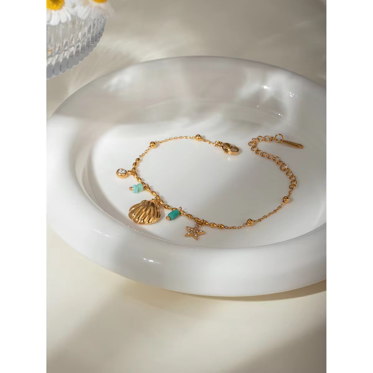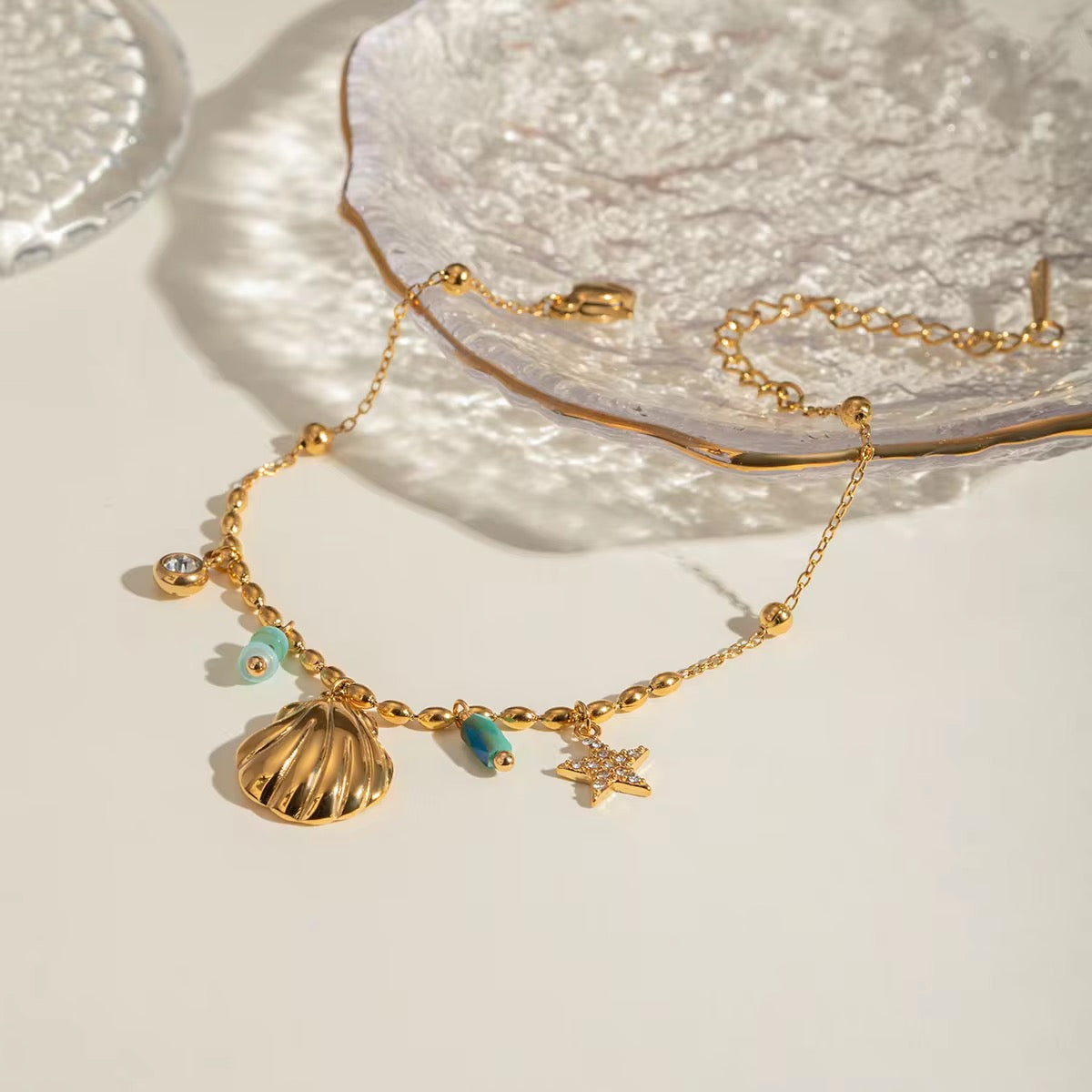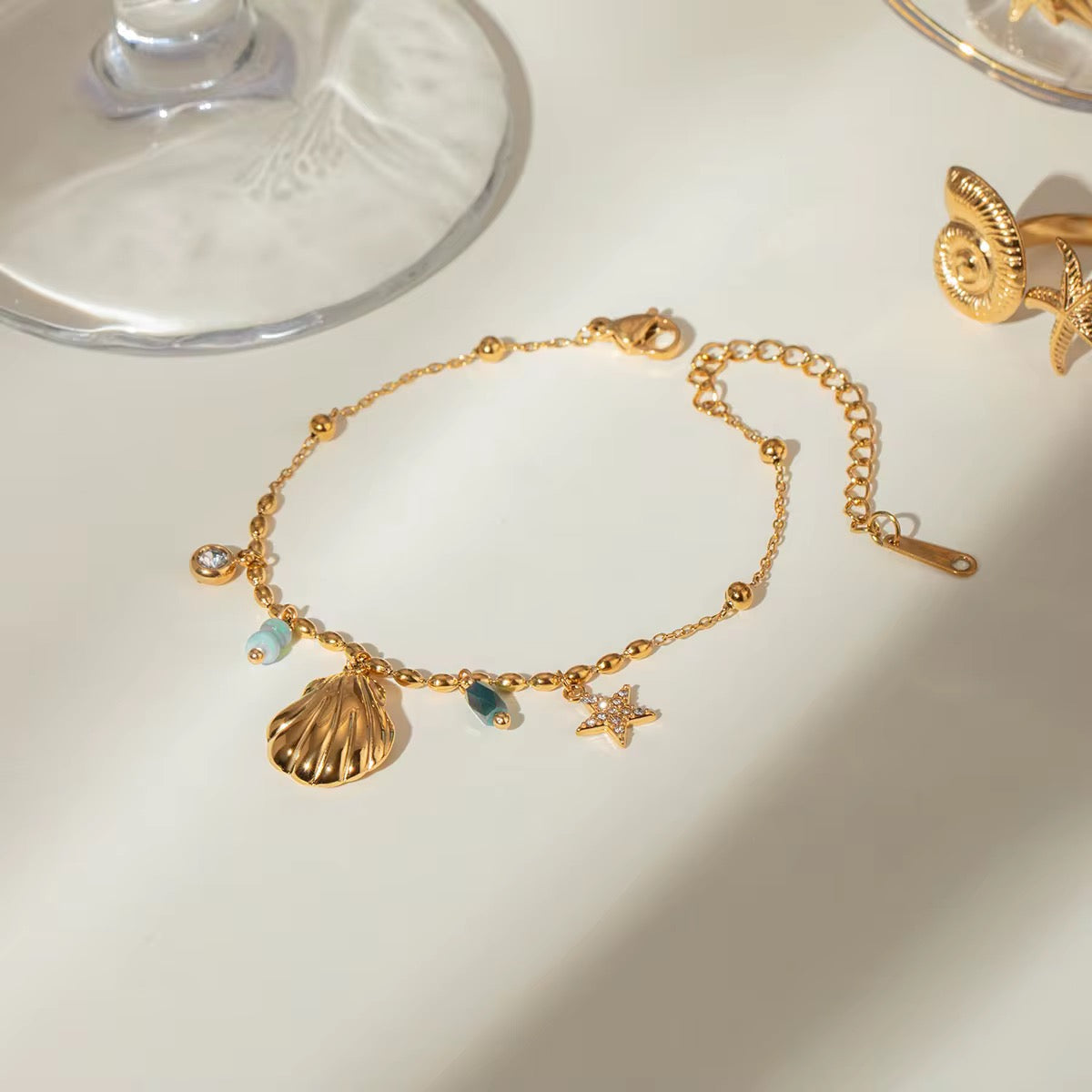 Embrace coastal elegance with the Seaside Serenade Charm Bracelet. Adorned with ocean-inspired accents, including a lustrous seashell pendant, a sparkling star charm, and delicate gemstone beads, this 18k gold-plated piece brings a touch of the sea to your style. Adjustable for the perfect fit, it's an effortless statement of beachside glamour.