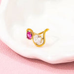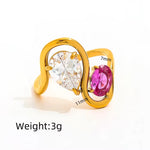 Bold and captivating, our Serenata twin Stone Ring features an artistic open design with two striking stones — a brilliant pear-cut clear cubic zirconia and a vivid oval-cut pink gem. Crafted in 18k gold plating, this statement ring combines vibrant color with sparkling elegance. Lightweight at just 3g, it’s comfortable for all-day wear and perfect for adding a modern, glamorous edge to any look. Hypoallergenic and tarnish-resistant for lasting beauty.