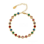 Elevate your wrist with the Serendipity Stones Bracelet, a dazzling blend of timeless elegance and vibrant charm. Crafted from 18K gold-plated titanium steel, this exquisite bracelet is adorned with multicolored zircon stones, creating a radiant and eye-catching design.