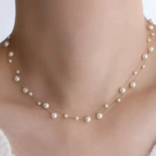 A delicate and modern necklace featuring two fine chains that artfully display a collection of lustrous freshwater pearls. The pearls, in various sizes, are spaced along the chains, creating a graceful, "floating" effect. This design offers a fresh take on traditional pearl jewelry, providing a sophisticated yet understated elegance that is perfect for layering with other necklaces or wearing as a simple statement piece. The varying sizes of the pearls add a subtle sense of movement and organic beauty, making it a versatile accessory for any occasion.