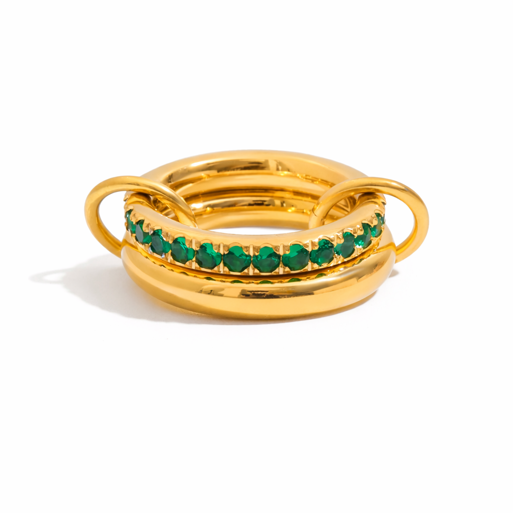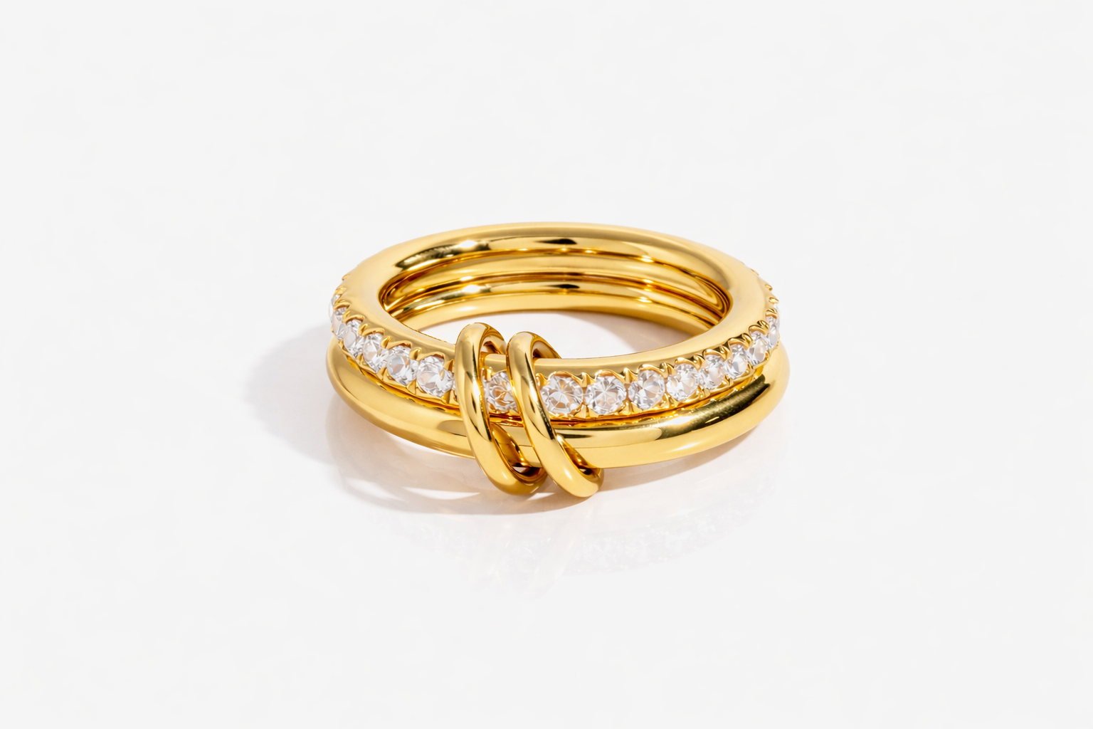 Crafted in a radiant gold finish and accented with brilliant stones, this interlinked ring symbolizes connection, balance, and timeless elegance. The fluid double-loop design adds depth and movement, while the crystal band brings just the right touch of shine—refined, never overpowering.