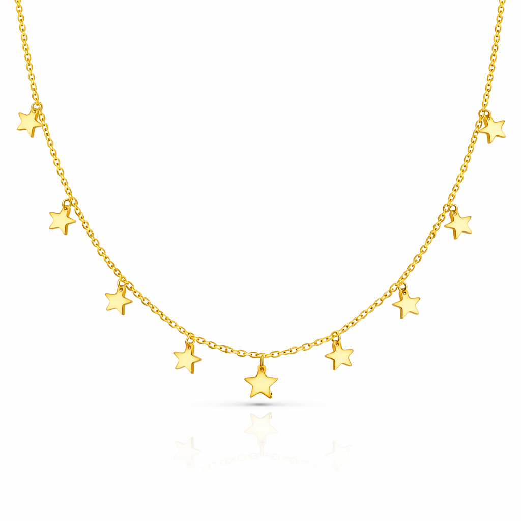 Elevate your everyday elegance with the Stellar Kiss Necklace. This dainty 18K gold-plated choker features a constellation of tiny star charms and tiny triangle charms delicately suspended along a fine chain. Lightweight and celestial, it adds a dreamy glow to any outfit—perfect for layering or wearing solo for a subtle statement.
