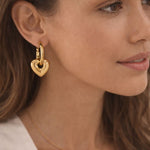 These stylish heart-shaped hoop earrings offer a delightful fusion of modern artistry and timeless charm. The design features a sleek, gold-toned hoop that secures with a lever back or hinged closure, from which a smooth, polished, and puffed heart charm dangles gracefully.