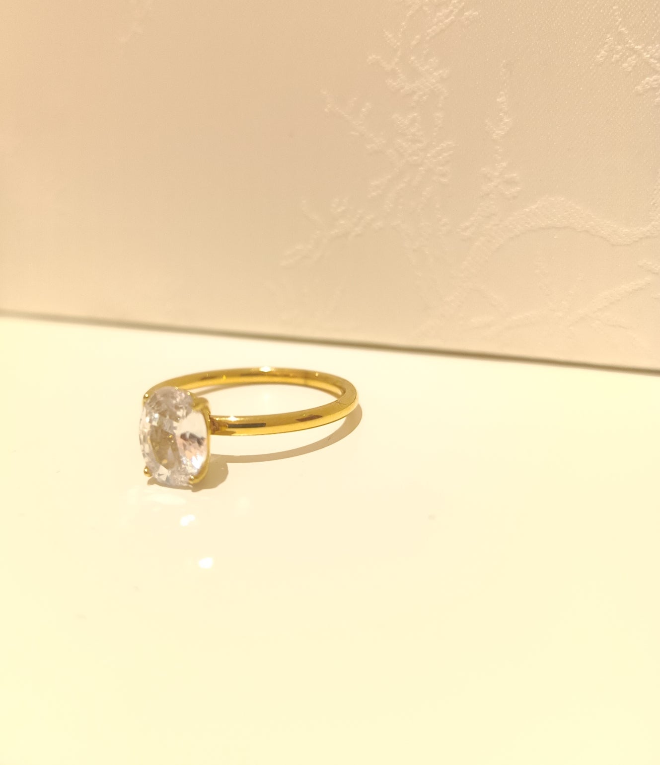 The Lumina Ring is a study in modern simplicity and captivating brilliance. Its design highlights a single, stunning oval-cut stone set on a delicate, polished gold band. The elongated shape of the stone offers a flattering, elegant look, while the minimalist solitaire setting allows maximum light to pass through, creating a radiant sparkle. This piece is a timeless yet contemporary statement, perfect for a modern engagement, anniversary, or as a sophisticated addition to any collection.0