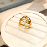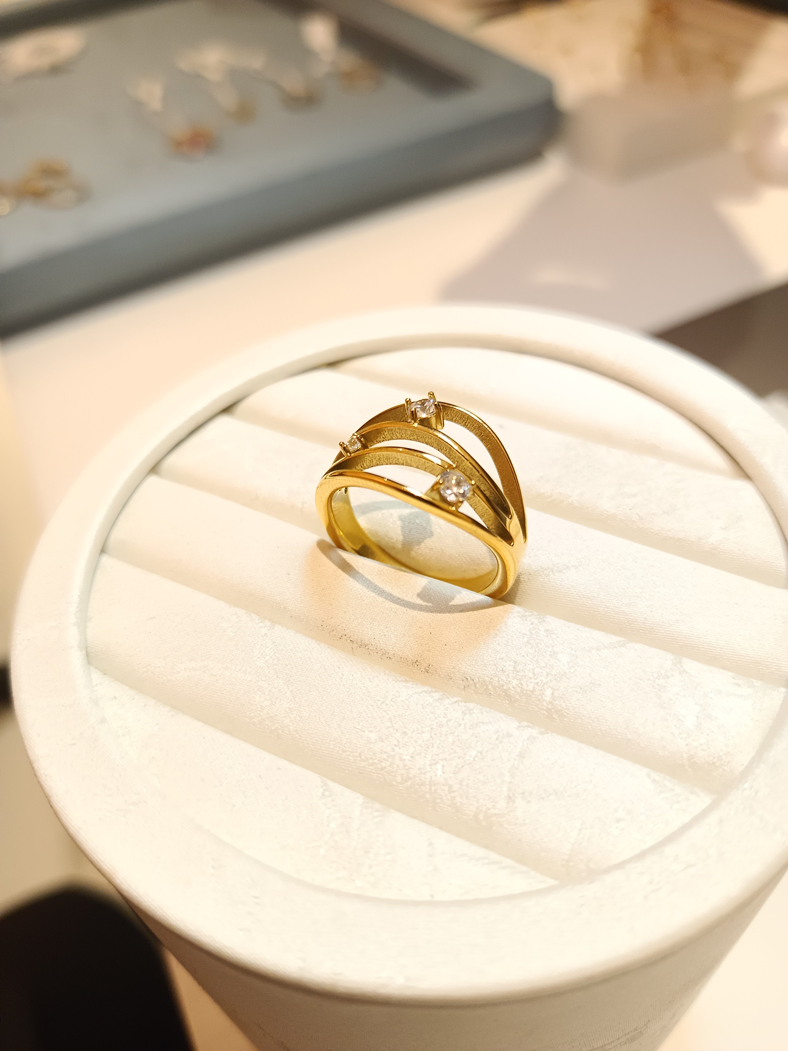 The Seraphina Ring is a masterpiece of fluid design, capturing the essence of movement and grace. This exquisite piece features a series of three polished gold bands that sweep and undulate like gentle waves, crossing over each other to create a dynamic and sculptural form. Each band is accented with a single, brilliant-cut diamond, adding a touch of sophisticated sparkle. The open, airy design makes it a comfortable and stylish statement piece for modern elegance, perfect for those who seek jewelry that is both artistic and timeless.