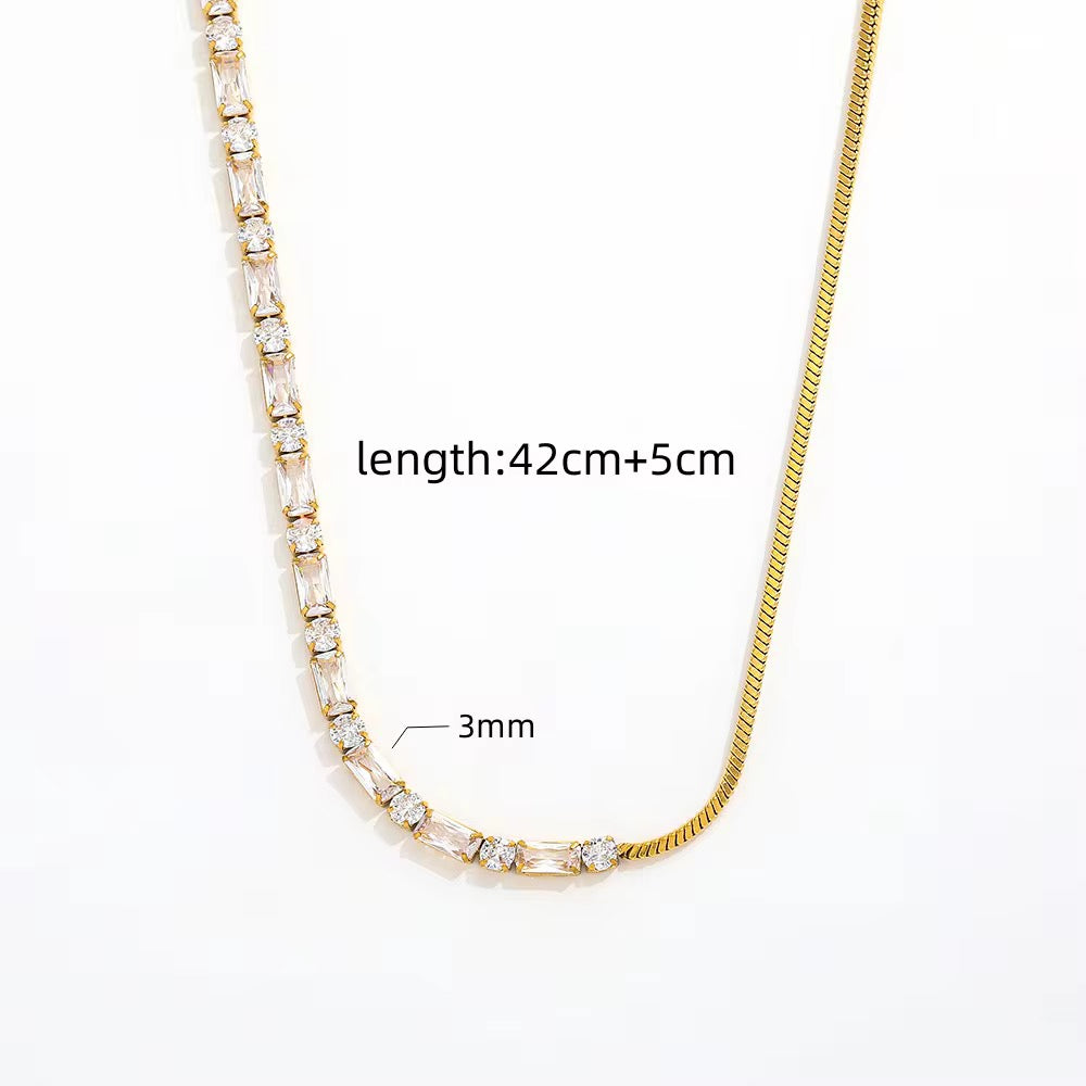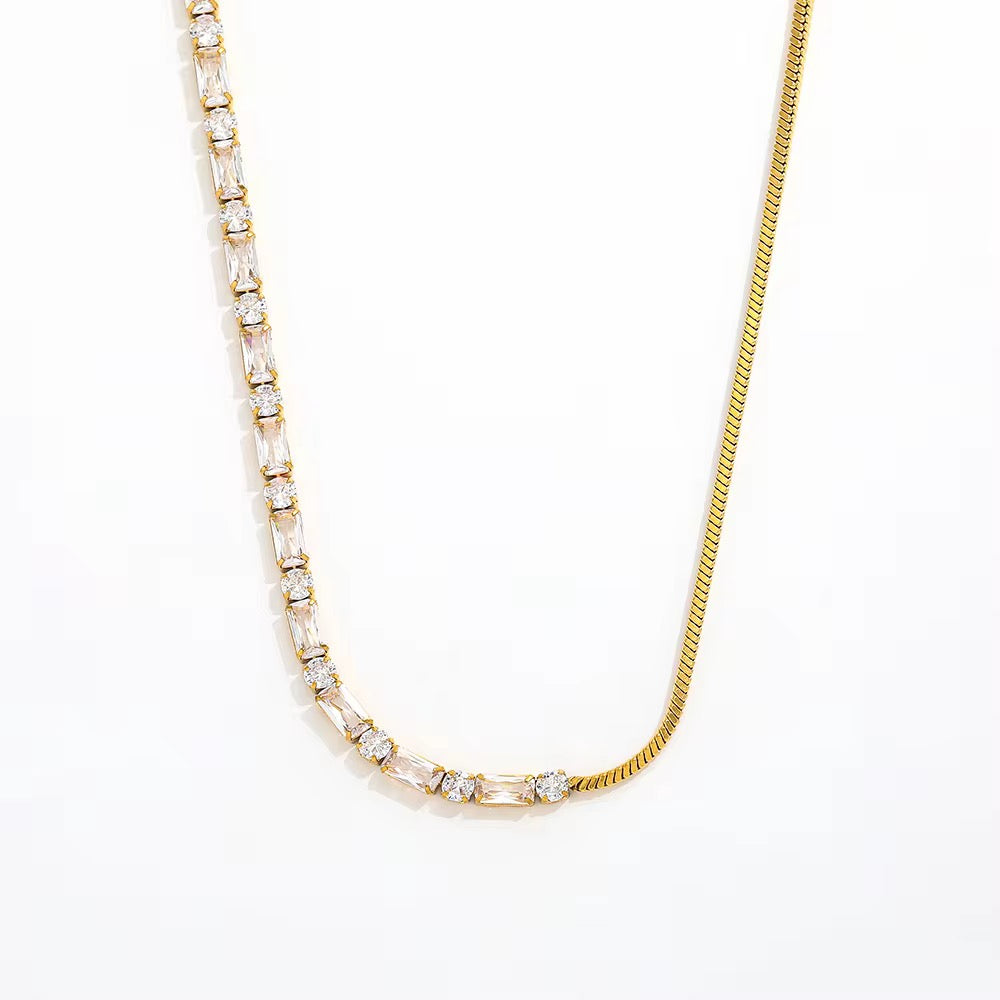 The Duality Necklace is a modern masterpiece of contrasting textures and brilliance. One half features a sleek, liquid-like snake chain that drapes elegantly, while the other half is a stunning line of baguette and round-cut stones that shimmer with every movement. The asymmetrical design offers a unique and sophisticated statement, perfect for those who appreciate contemporary style with a touch of timeless glamour.