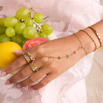 Add a splash of color and elegance to your ensemble with the Tropical Mirage Hand Harness. This exquisite 18k gold-plated bracelet-ring chain features a graceful design adorned with multicolored cubic zirconia stones and dainty beaded accents. Connecting two statement rings to a delicate bracelet, this piece wraps your hand in a radiant fusion of charm and sophistication. Perfect for festive occasions or to elevate your everyday style with a hint of boho-luxe glamour.